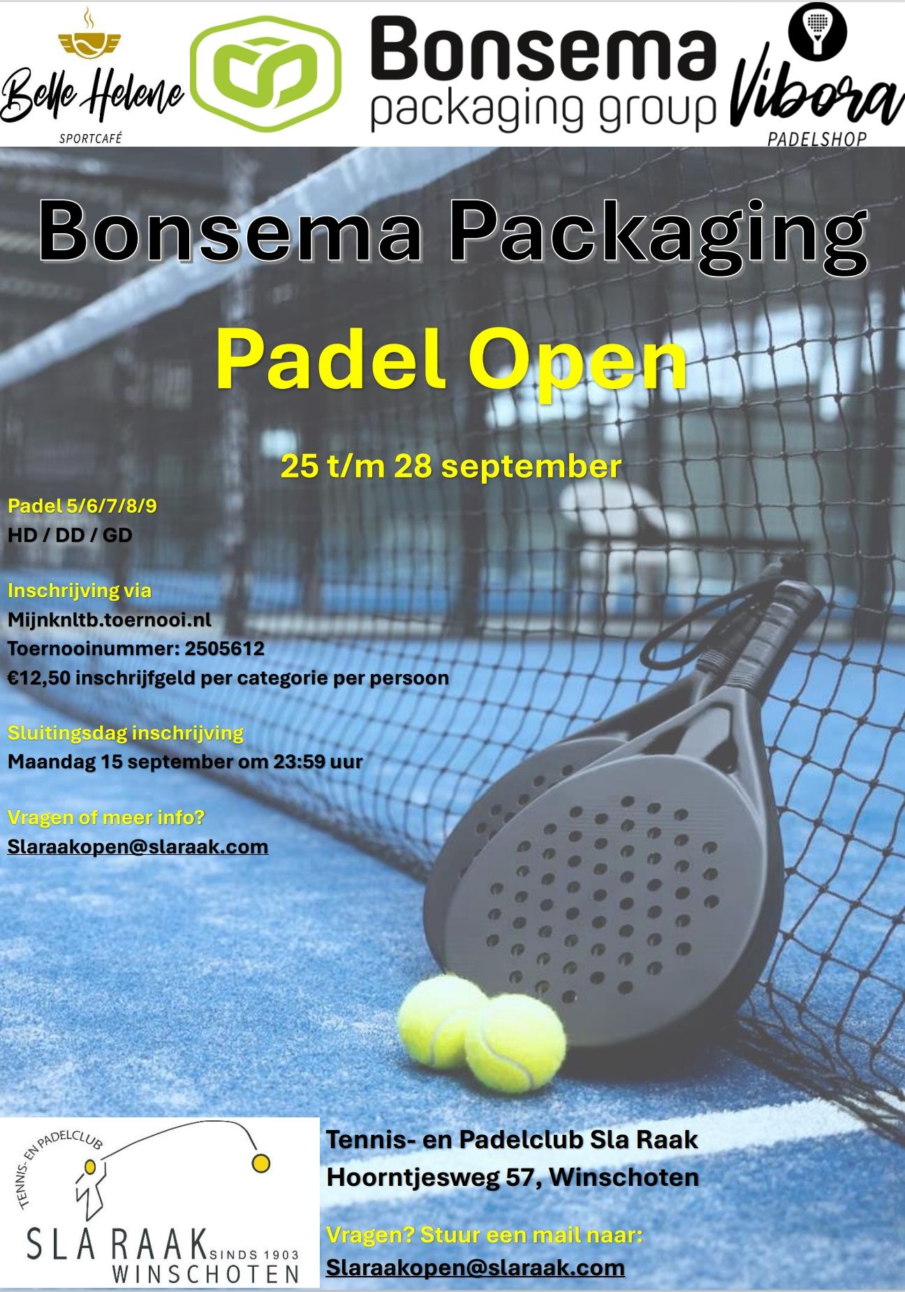 We kijken enorm uit naar deze allereerste editie van de Padel Open 2025 powered by Bonsema Packaging Group. Schrijf je snel in, trommel je partner op en zorg dat je erbij bent bij dit nieuwe, sportieve en gezellige padeltoernooi!