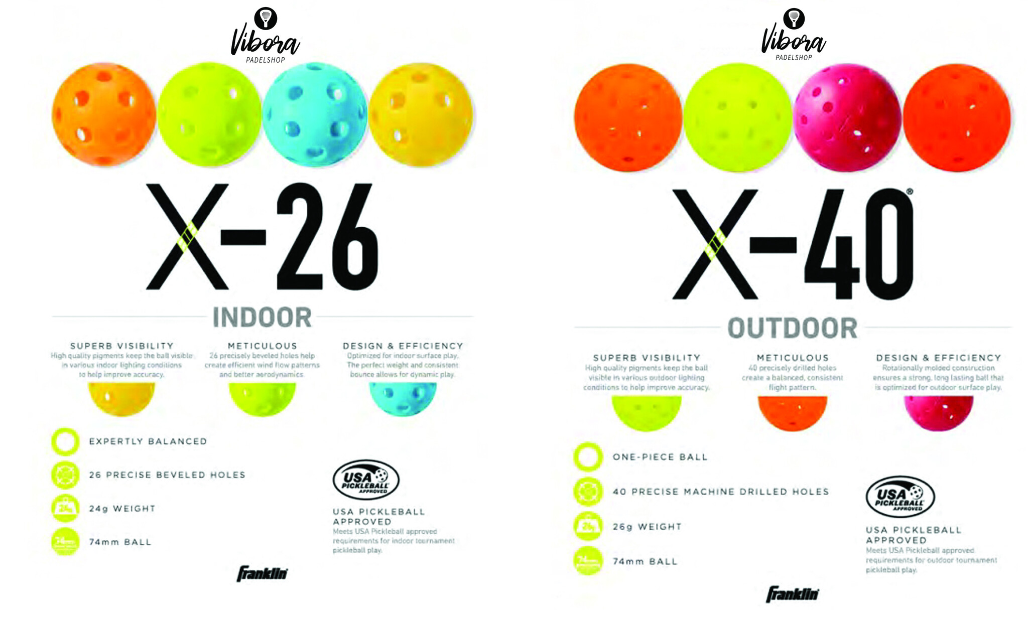 Ballen: Franklin’s nieuwe ballen zijn ontworpen voor optimale prestaties op zowel binnen- als buitenterreinen. Met verbeterde vlucht- en balanseigenschappen, zijn ze perfect voor zowel recreatief als competitief spel.
