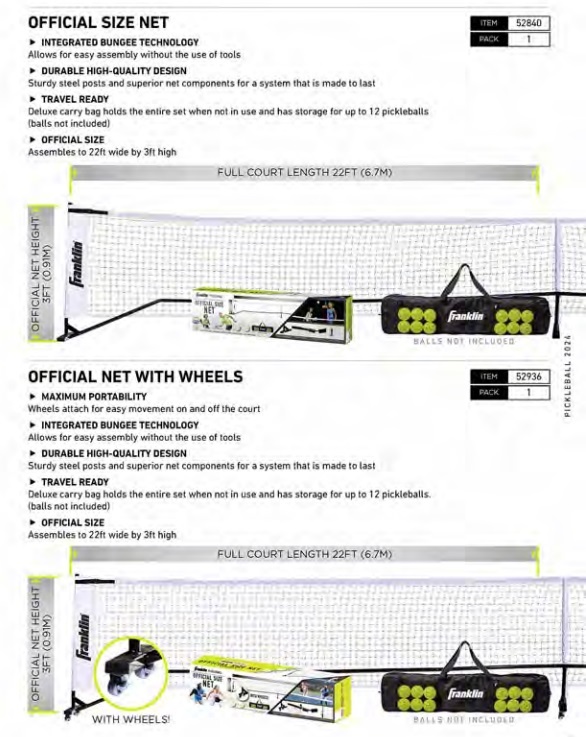 Toernooi Netten en Lijnmarkering: Voor de organisatoren van toernooien en voor degenen die hun eigen speelveld willen inrichten, biedt Franklin hoogwaardige netten en lijnmarkering. Deze producten zijn ontworpen om te voldoen aan de officiële normen en dragen bij aan een professioneel en nauwkeurig speelveld.