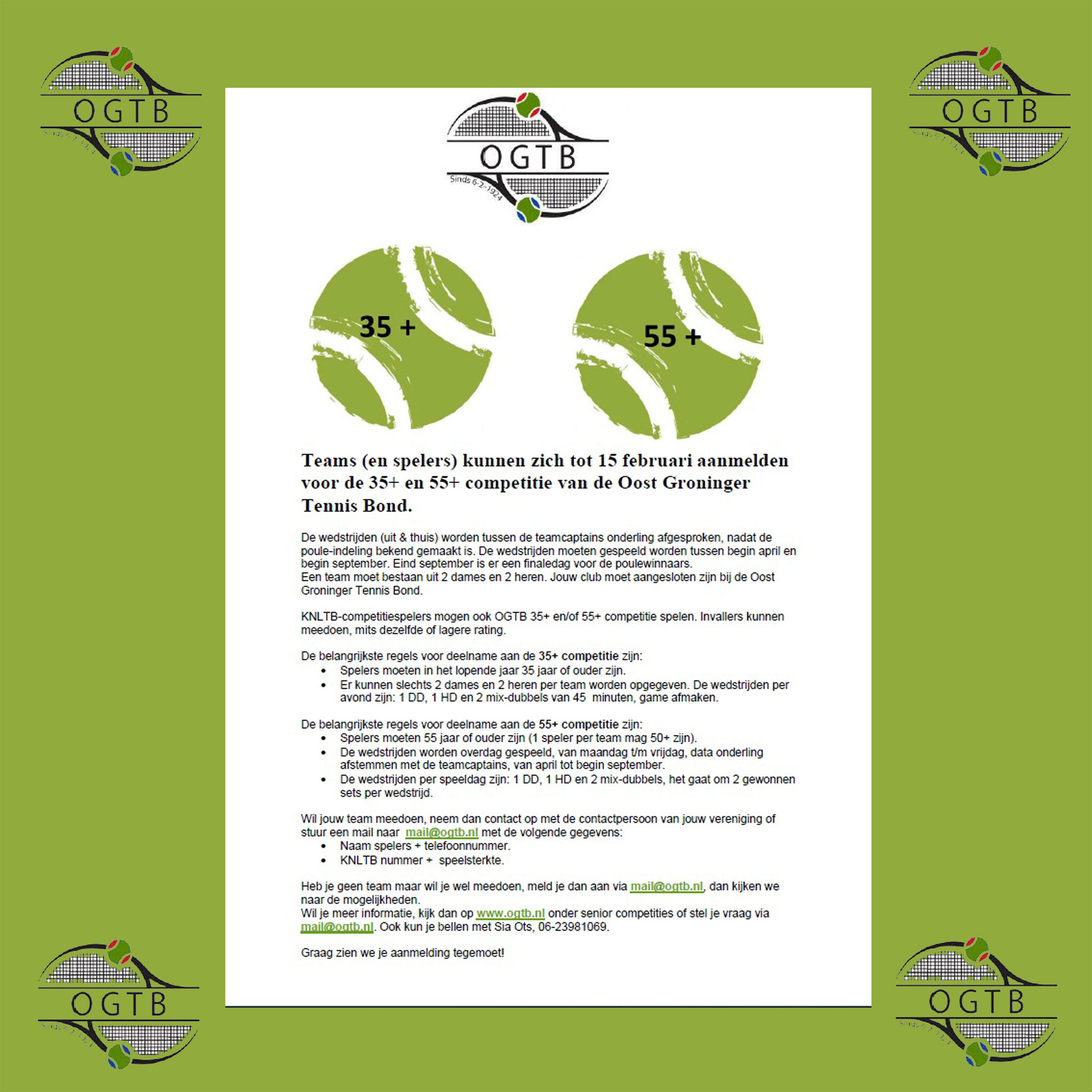 Heb jij een voorliefde voor spannende rally’s, stevige smashes en gezellige sportieve middagen? Dan is dit jouw kans om in actie te komen! De Oost Groninger Tennis Bond (OGTB) nodigt je van harte uit om deel te nemen aan de 35+ en 55+ competitie. Of je nu een doorgewinterde dubbelspeler bent of je mixdubbels naar een hoger niveau wilt tillen, deze competitie biedt plezier, uitdaging en een flinke dosis humor op de baan.
