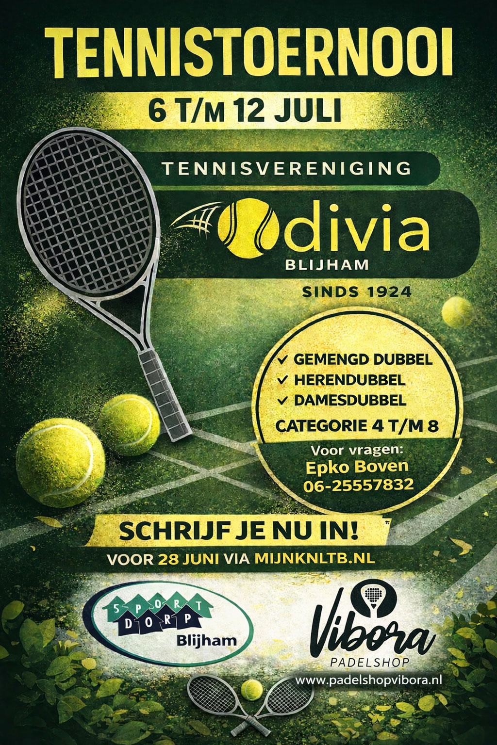 Een evenement als dit draait niet alleen op vrijwilligers, maar ook op sterke lokale partners. Dit jaar wordt het toernooi mede mogelijk gemaakt door onder andere Padelshop Vibora en Sportdorp Blijham.