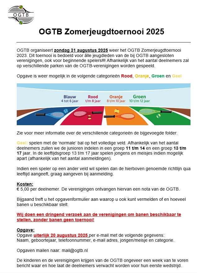 Dit toernooi is er voor álle jeugdleden van de OGTB-verenigingen. Dus of je nu al jaren smasht alsof je Novak Djokovic heet, of je nog steeds af en toe de bal met je racket probeert te vangen (ja, we hebben je gezien – dit is jouw kans!