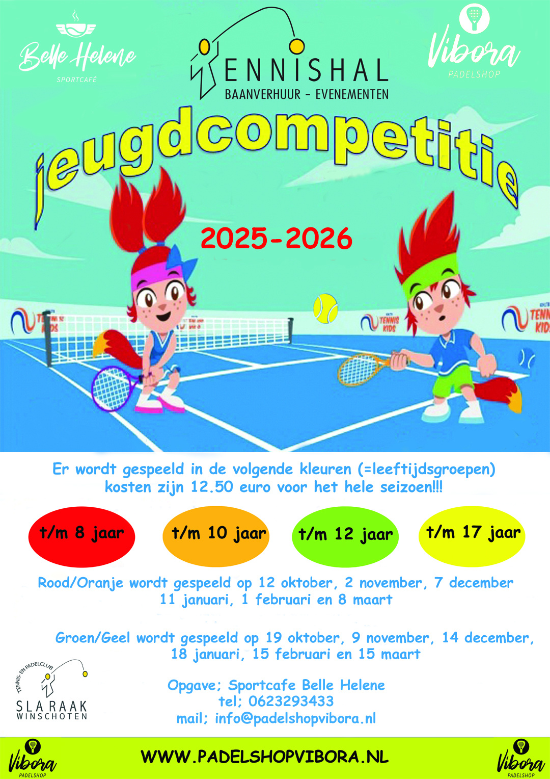Elk jaar organiseren Sportcafé Belle Helene en Tennishal Winschoten een dynamische competitie voor kinderen van álle niveaus, verdeeld in de bekende KNLTB-kleurgroepen: rood, oranje, groen en geel. In dit seizoen nemen kinderen twaalf zondagen lang deel aan spannende wedstrijden vol sportiviteit én gezelligheid. Deelname kost slechts € 12,50 per kind.